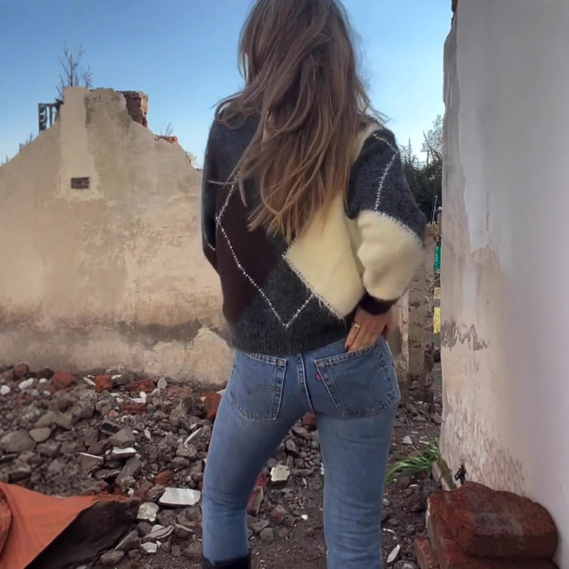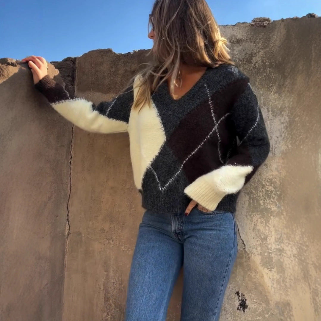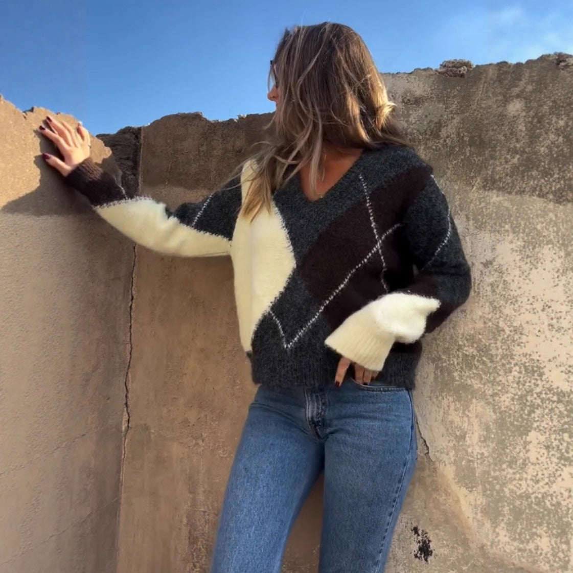 Women's All-match Plaid Printing Color Contrast Casual V-neck Long-sleeved Sweater
